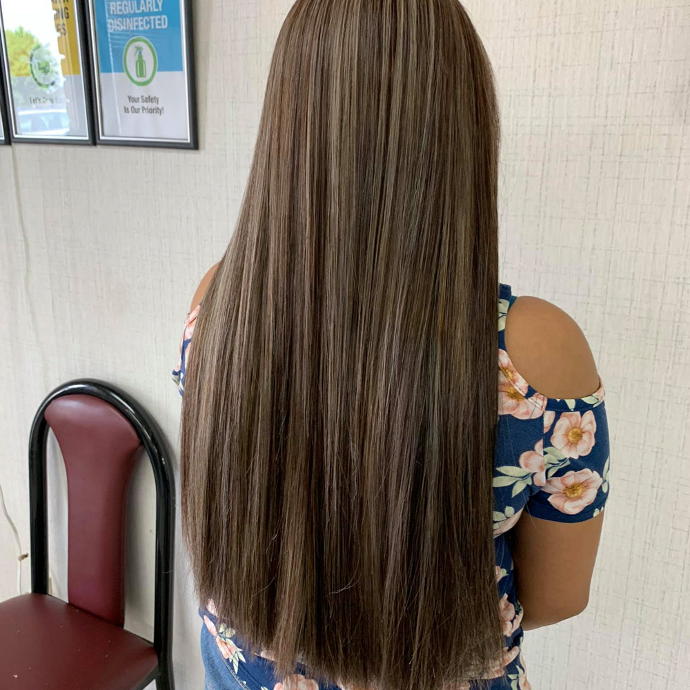 A highlight creates a contrast and brightening effect throughout hair. Includes full head of foils or hand painted techniques. Up charge for longer or thicker hair.